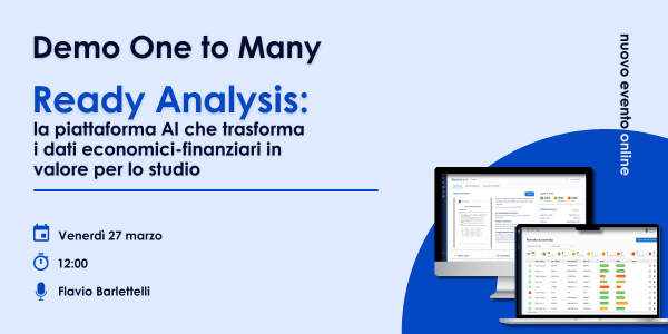 Per questo, per il mese di marzo abbiamo organizzato un nuovo appuntamento dedicato al settore: una demo online in formato “one to many” per presentare da vicino Ready Analysis, la piattaforma potenziata da Intelligenza Artificiale sviluppata per supportare lo studio nell’analisi e nell’interpretazione dei dati economico-finanziari.